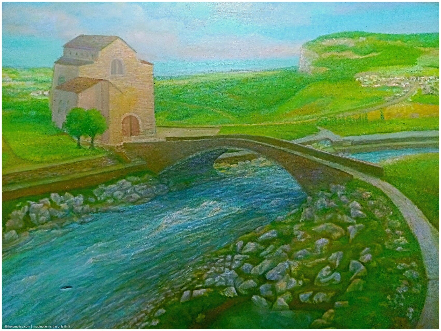 The central stone structure is not a simple dwelling; it is the mind’s internal fortress, built of the same 'perfect green' that requires patient observation and compassionate presence to find. By meticulously grading the green fields leading to it, I sought to capture the arduous process of calming the internal landscape.